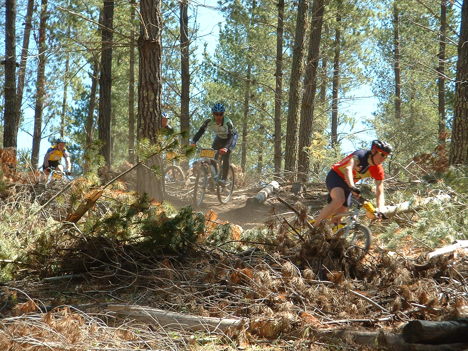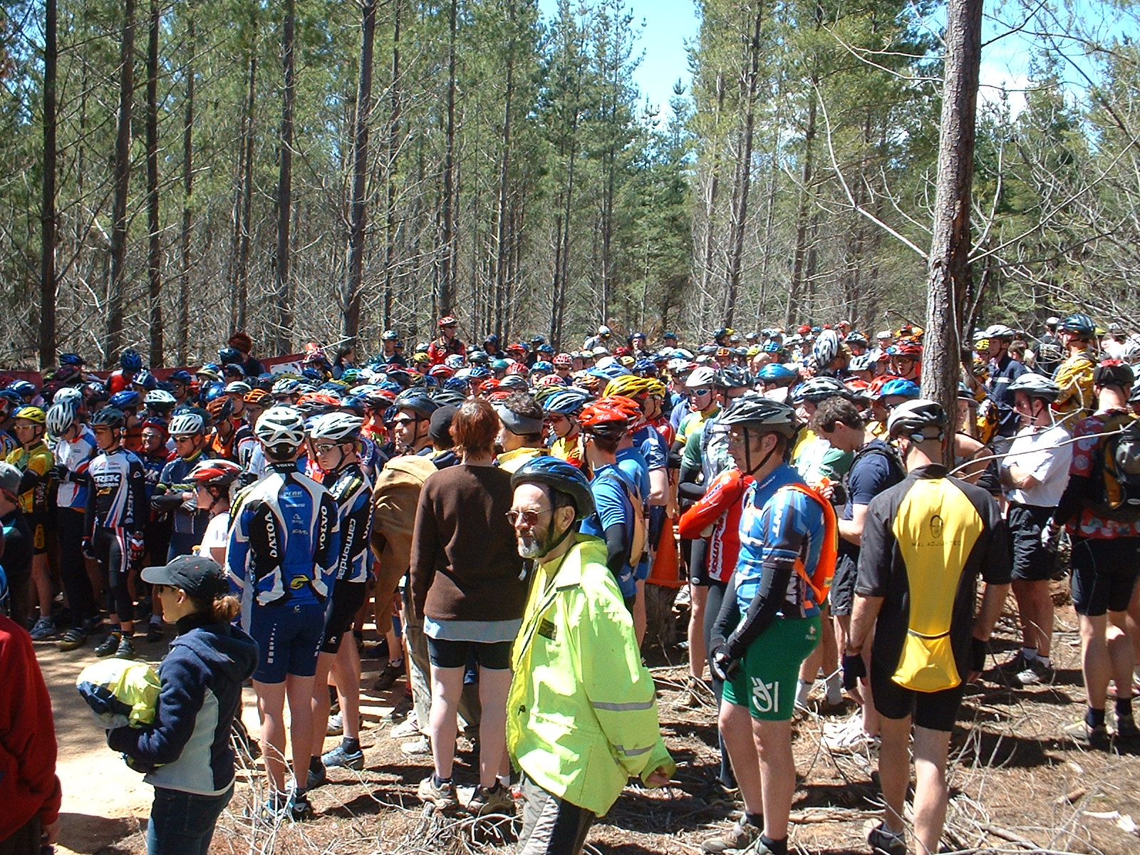 David Baldwin's Race reportMy team was the "Purple Pickle Peddlers" - a name easily arrived at since we all meet on Friday mornings at the PP for a MTB ride and then breakfast afterwards - we even got a team jersey and nicks made up for the occasion. The team was Julie, me, Steve Hanley and Araron Broughton. After last year we'd decided that male team of 4 was a hiding to nowhere battling it out with pro riders, and Julie had worked hard in a 6 chicks team for third, but mixed 4s was soft as. Our 4th male rider wanted to ride solo so the entry was made the day they opened!Our forward party was despatched on Friday morning to secure us a prime campsite, complete with marquee and adjoining sleeping tents. We were sharing digs with "The Mortal Fools" - Sam Reinhardt, Ben Crabb, Andrew Rowe and Pete Bartholomew. Julie and I got out there about 8am, unpacked the car and got a chance to use the toilets. These became blocked a few hours later and were only working about 20% of the time. Great idea to have flush toilets, but a wonderful illustration of capacity planning gone wrong and/or total underestimation of flushing habits. It seemed there was not enough water to flush them, and then the tanks filled up (wonder where all that water went?). Trev could teach them a thing or two I'm sure. Anyway, the rest of the team and the Fools drifited in over the next couple of hours. Checked out the switchbacks to see what vantage points there would be for the race start action. Steve was keen to ride the first lap, despite being the slowest runner in our team, but no one was arguing. Wandered down to the start assembly area and stood on a pile of thinnings to overlook a small sea of helmets going 50m back down the fire trail - almost like a fun run start! With over 400 teams/individuals the crowding was going to be an issue for the first lap or two. Back to the transition area with enough time to see the leaders come sprinting past, see Steve amble by and grab his bike, them jog over to the switchbacks. Noted one guy in a silver body suit, a little bit back on the run, but clear first down the switchbacks. In no time a steady torrent of riders was pouring down the track. Apparently some guy came to grief somewhere on the first lap, smashing his collarbone, and there was a queue to get past him. I was 2nd rider, so got ready for my start and joined the huge crowd waiting for changeover. We were expecting Steve to do nearly an hour, so there was no point being in the way at the front, although many people seemed convinced their first riders were superstars. Steve appeared and I was off, immediately passing people on the first climb, a pattern which was to become very familiar. I can't remember a lot about individual laps, so I'll just give the highlights of the course. After the initial climb there is a fast section where you can spin along building up a good head of speed for the entry to the switchbacks. If I was lucky there would be no one in the way and I could scare myself heading into a mass of tree roots and easy corners bouncing like mad before the first part of the descent. The tight corners are all really well bermed so were pretty easy to get round at speed, but they got a bit chopped up with braking ruts anyway. The last drop gets the speed up again for a hard right turn into another bumpy twisty section - fairly typical of the singletrack sections of the course. Exitting the singletrack onto a firetrail for another dose of speed through a dip, then a hard left and another dip through a creek. Every lap I'd end up with wet feet at this point - fortunately I'd taken enough clothes for a small army and was able to wear fresh socks and tops and generally dry knicks for every lap. Now the climbing starts in earnest. The next few kms are a steady climb with a few steep pinches - nothing you can't get up in the middle ring if you're fresh, but there were people walking long stretches. A couple of sections of singletrack where you can power through all the corners, then a firetrail climb of about 200m, usually with a fair procession of riders grinding their way up. A right turn onto the ridge continues the climb, but with plenty of spinning sections where time can be made up. Finally the tower comes in sight and the start of a singletrack descent. This descent got progressively more chopped up, but was mostly quite fast although fairly rough with bumps and dips. Not much space for passing though, so it was a lucky lap where you didn't get bottled up by halfway through. Onto another firetrail dip which a good burst of speed would get you out the other side nicely. One lap a couple of gumbies were braking going into it though and I nearly rear-ended them and had to go wide on the loose rocks to avoid a collision. The next descent had a few off camber corners and was a bit longer with a mean little climb halfway through it which had only just been added to the course a week or so ago. Finally exit to the fire trail at a water bar with enough hill left to really get some speed up along a straight track. The next section of singletrack had been a total quagmire the previous weekend, and fortunately had been removed, replaced by a section of climbing firetrail and a little descent before rejoining the singletrack. More climbing but a fairly easy grade and plenty of passing spots. Each passing manouevre required a short burst of effort though which took it out on a long climb, and for the solo riders or others doing many laps meant a difficult choice of sitting in or flogging themselves - neither choice much good, but at least sitting in would have given them a break. On my first lap whil epassing my middle chain ring started to skip, giving me a bit of grief for the rest of the lap. Another singletrack descent with a couple of tight corners, a fast firetrail descent into another singletrack where you could test yourself as to how much fear/speed you were prepared to cope with as you bounced through tree ro
