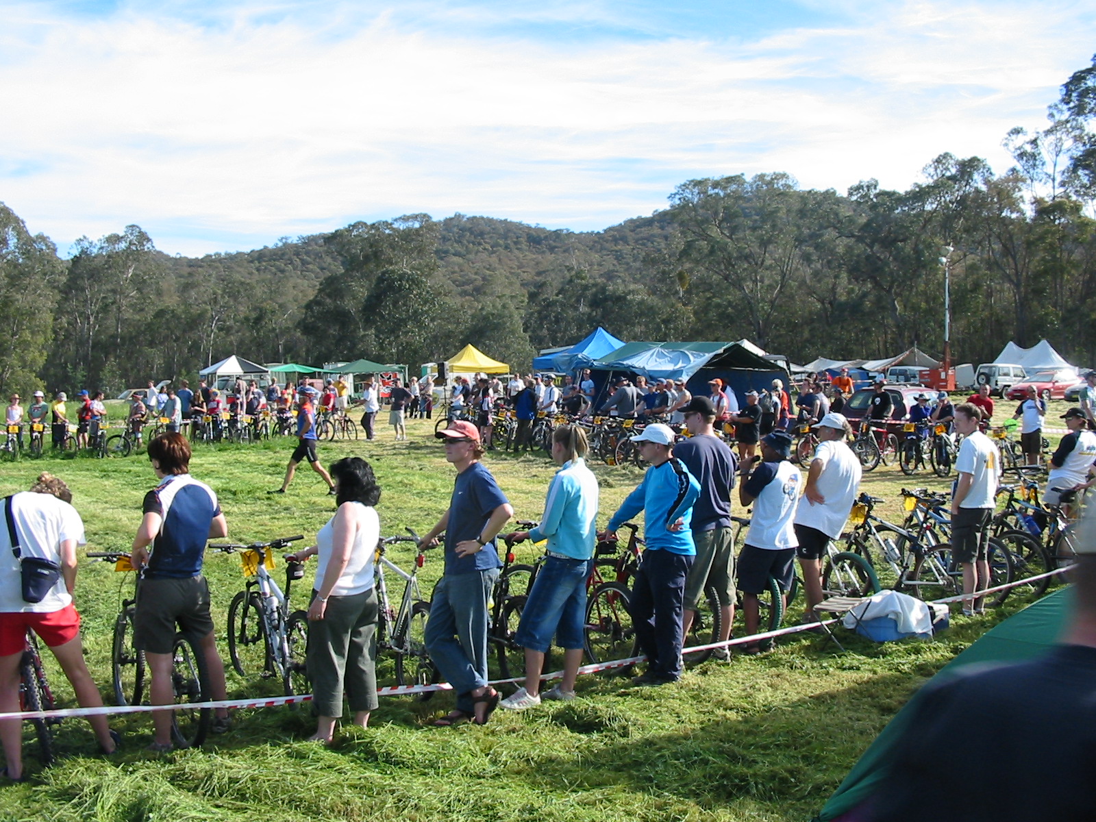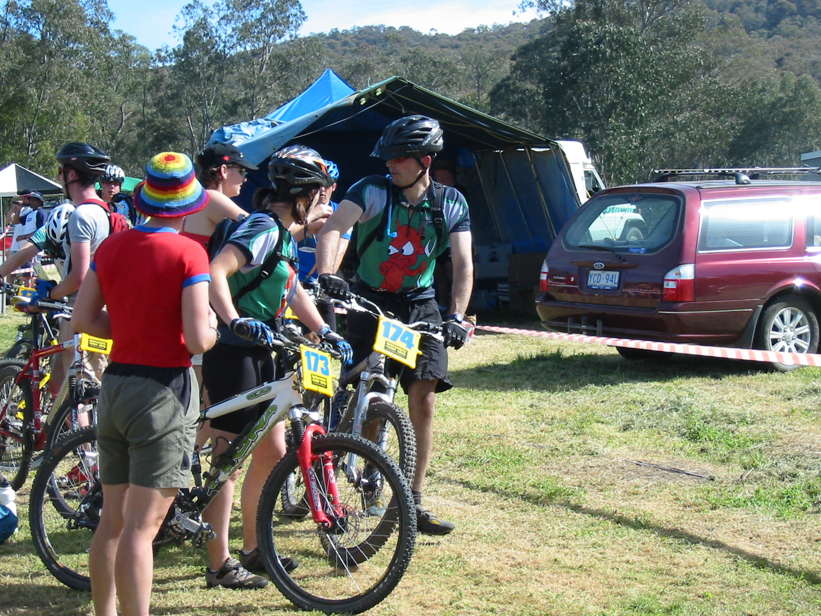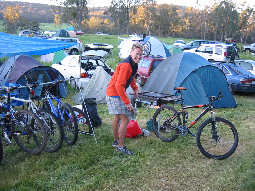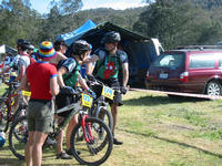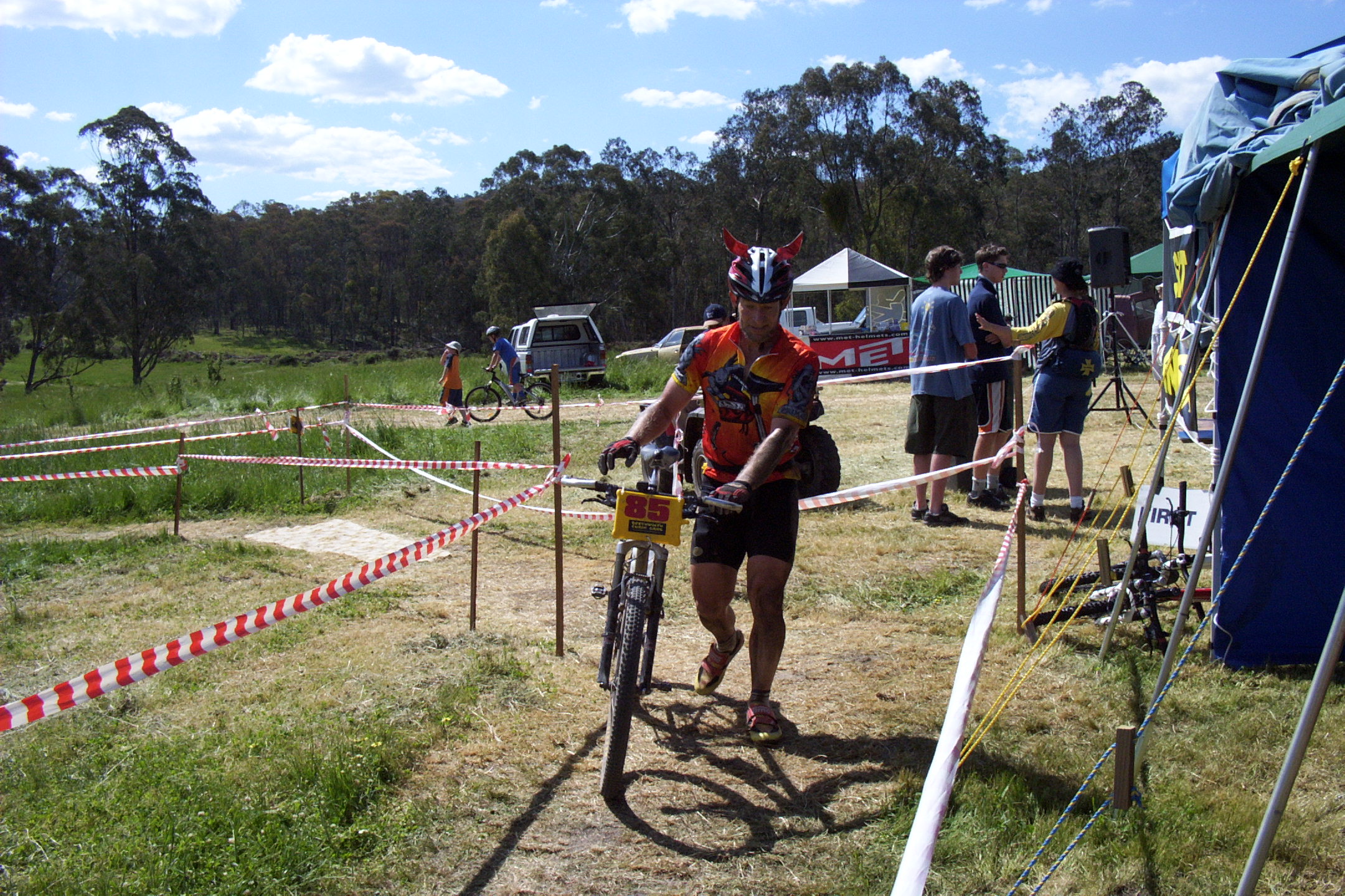 I have a copy of the race results online. Photos by Steve Hanley, Martin Zweep, Russell Baker. More photos at the bottom of the page from David Morgan.. Michael Carden has told many of us that the Beechworthchaingang mtb club can put a good event on. Some of the Wagga crew agreed and told us about this race. It sounded fun, beautiful part of the country, lets go do it. Sam originally agreed to do the event in Mixed Pairs with me, then as a way to convince Ben to come on down to the race we got him onto our team as well. Sam, Max and I drove down to the race on friday afternoon, arriving around 6pm to set up camp and registered our team. Upon arrival we found Martin and the Wagga crew with a good camping area a long way from the noise of the event centre. Ben decided to go to work on friday so would be arriving around midnight to the camp. Once Ben arrived we got a good 6 hours or so sleep in and awoke to a clear morning, it was obviously going to get hot soon if the temperature at 7am was anything to go by. Rather than sit around playing convoluted games of Rock, Paper, Scissors with Jim making up new rules in order to choose who rode first on our team I volunteered to do the first lap. I almost regretted it when they announced the run would be from the bottom of the campsite all the way up to the transition, they relented and only made us run half way up the hill so it wasnt so bad. As usual the first lap was a bit crowded, well at first, on the long granny ring climb up heart break hill it thinned out a lot and the rest of the lap was not congested. My impression of the course was, fun, maybe with a bit too much firetrail in the middle, and also a wasted drop on fireroad that should have been on single track. The lap starts with a very fast downhill over open farm paddocks to a Dam, accross a little bridge and then climbs up towards the edge of the paddocks. Through a gate and along the outside of the fence line to the top corner of the paddocks and then into the first ST section, in native bushland. At this point we have a fast big ring, 30 or 35 KMH single track section called "Single Track Mind" for a while and then we turn sharply and head into a section called "Gravity Drop", this ia a fun off camber series of switchbacks going down a hill. At the bottom we cruise through more ST all big ring stuff for a bit and then come out onto fireroad at the first marshall point after a few little fun cornery singletrack bits. At this point we have reached the base of "heart break hill", this is a 5 minute or so granny ring climb, not the steepest bit on the course, but it is long and you have to pace yourself and spin to get up it reasonably. Once at the top we head down losing all the height we just gained on a fast sweeping fireroad downhill called "Yahoo", this is fun with loose corners and you have to be a bit careful, however I would have prefered they used more single track downhill here, as you ride down you can see quite a lot of ST entrances taped off. After this we stayed on fireroad for a long time, with a few steep pinches (granny ring bits), two long dips one down to some logs I always worried I would pinchflat on and one down to a deep puddle crossing, finally we climbed up to another marshall point and got back to some open paddocks from where we could see the event centre again. This was deceptive though as we soon entered more single track and would not get back to the camp site for around 10 minutes. The single track here was bumpier than the stuff early in the lap, still in native bush, lots of fun to be had with tight twisting bits, a steep drop down to a wide bridge, a few dips and gullies, etc. After all this we climbed up to the base of the campsite and had to climb up the side of the campsite on a slightly grassy track, this was never too bad though as all day there were always people cheering you on for this whole climb, and hey the lap was almost over. On the whole I really had fun on the ST on this course, it was well built, the off camber switchbacks were correctly benched and shelved so water would not ruin them, the changes in speed flowed correctly in all ST sections so you didnt use brakes unnecessarily and cause bad braking ruts all the time. I think they needed more ST, however the firetrails were not so bad as it was gorgeous bushland we rode through. After my first lap I handed over to Sam and headed down to the campsite to relax and eat. During the course of the day, the weather got hotter however Sam, Ben and I all kept consistent lap times, Ben set the fastest lap time on the team doing his first lap, on the whole Ben and I hovered around 45 or 46 minutes and Sam around 52 minutes. When we worked out the laps we would do as it started to get dark we realised that interestingly I would not have a night lap as it was unlikly to get dark until around 7:45pm which was later than I was expecting to get back from my last lap. This could possibly have turned out bad as I do a lot of night riding and Sam and Ben almost never get off road at night. After the lap I was far too pleased to be finished and feeling too worn out to think much about it. In the end it didn't matter as Sam and Ben put in good night laps and Ben clawed back quite a lot of time over the next placed team on his final lap, even though he had two crashes on that lap. At around 6pm Russ had told us we were only two minutes ahead of the next placed team, Ben started watching and said he thought he had seen evidence of them passing us. By the time Ben finished our final lap at around 9:25pm we thought we were in second place. So when Sam and I went up to the presentations to hear how we went we had quite a surprise when they announced we were in first place. We collected our medal and were instructed to pick a prize each from the table of prizes. By this time I have to admit I was struggling to take notice of much of my surroundings. When I had finished my final lap I walked down to the camp and