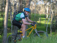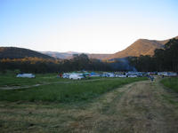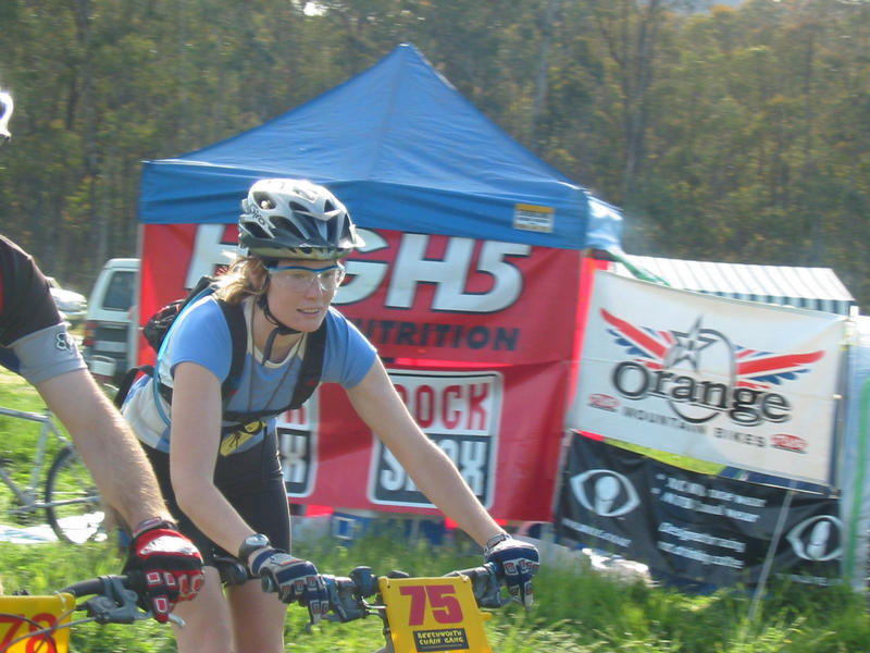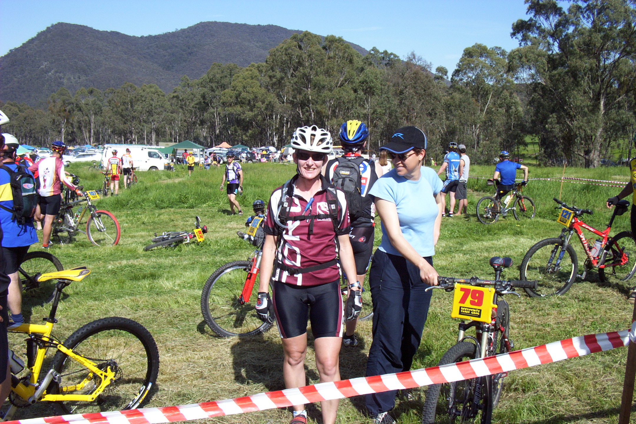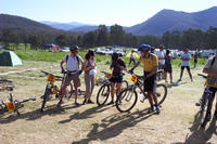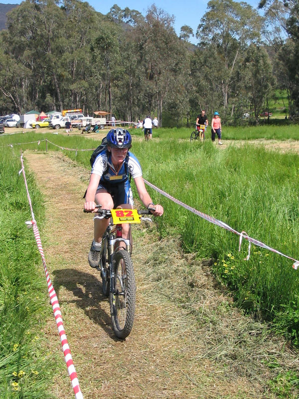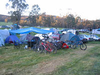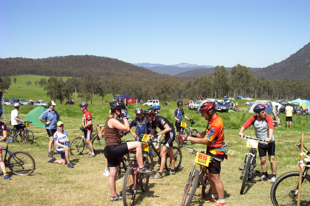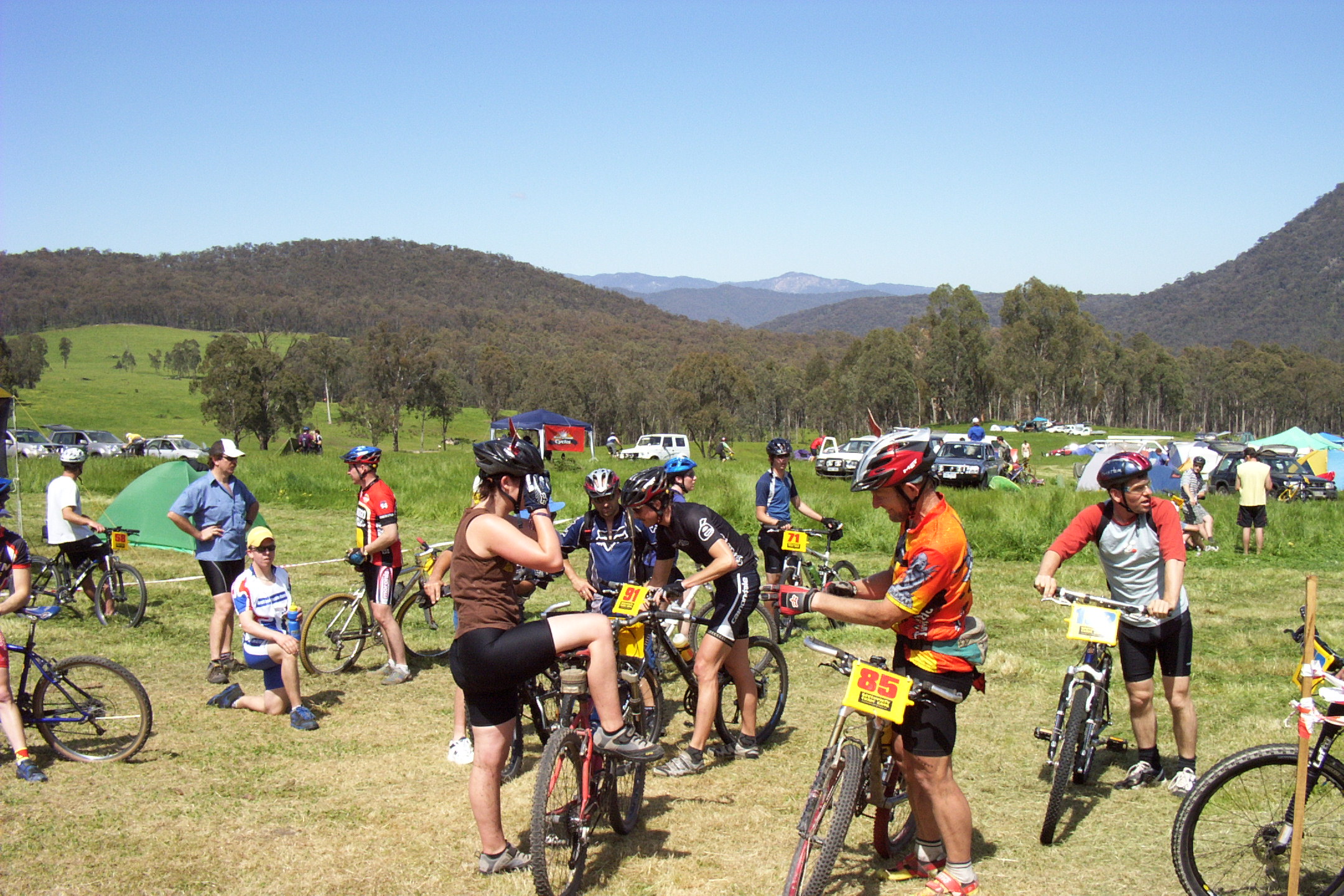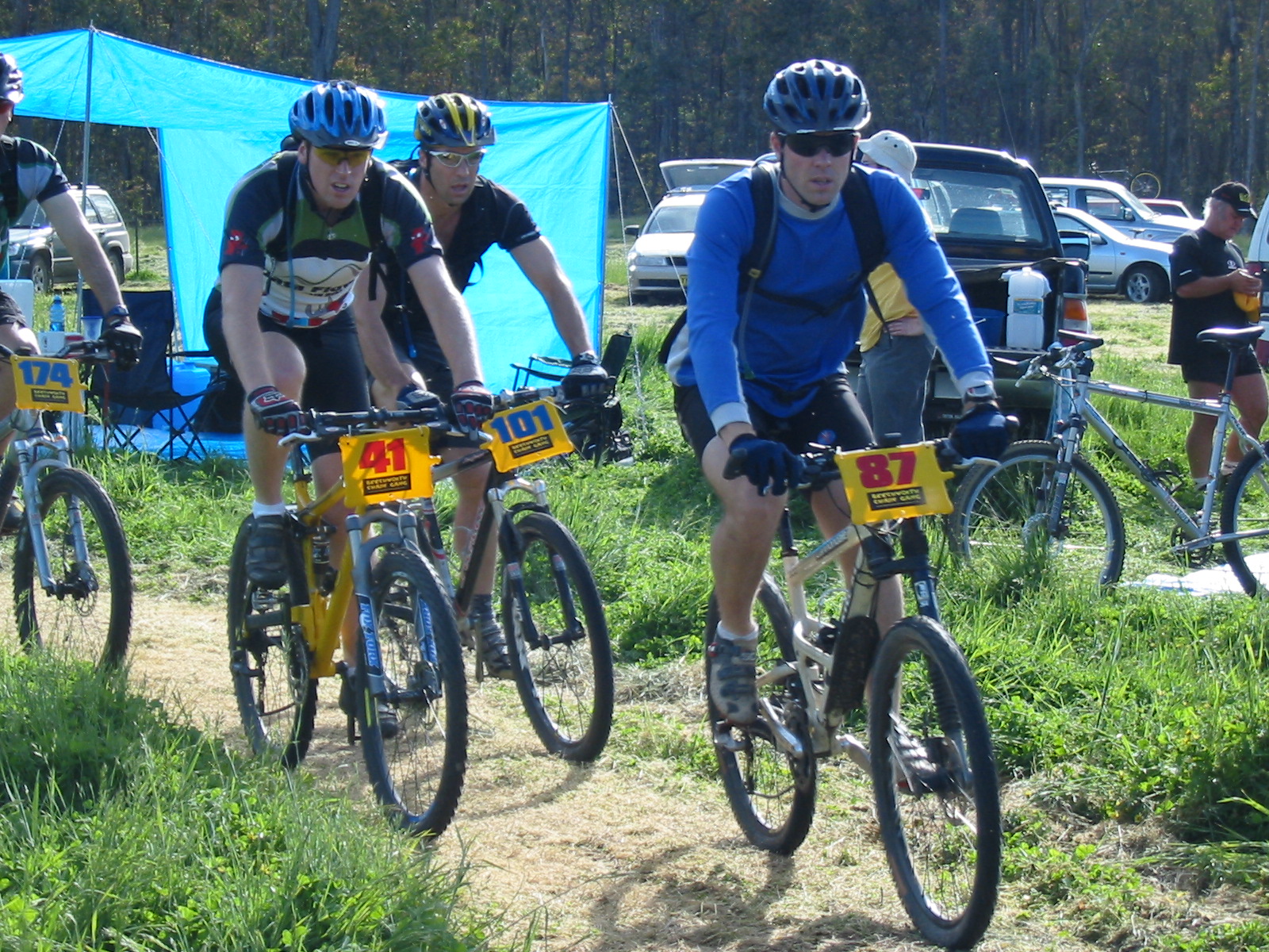 I have a copy of the race results online. Photos by Steve Hanley, Martin Zweep, Russell Baker. More photos at the bottom of the page from David Morgan.. Michael Carden has told many of us that the Beechworthchaingang mtb club can put a good event on. Some of the Wagga crew agreed and told us about this race. It sounded fun, beautiful part of the country, lets go do it. Sam originally agreed to do the event in Mixed Pairs with me, then as a way to convince Ben to come on down to the race we got him onto our team as well. Sam, Max and I drove down to the race on friday afternoon, arriving around 6pm to set up camp and registered our team. Upon arrival we found Martin and the Wagga crew with a good camping area a long way from the noise of the event centre. Ben decided to go to work on friday so would be arriving around midnight to the camp. Once Ben arrived we got a good 6 hours or so sleep in and awoke to a clear morning, it was obviously going to get hot soon if the temperature at 7am was anything to go by. Rather than sit around playing convoluted games of Rock, Paper, Scissors with Jim making up new rules in order to choose who rode first on our team I volunteered to do the first lap. I almost regretted it when they announced the run would be from the bottom of the campsite all the way up to the transition, they relented and only made us run half way up the hill so it wasnt so bad. As usual the first lap was a bit crowded, well at first, on the long granny ring climb up heart break hill it thinned out a lot and the rest of the lap was not congested. My impression of the course was, fun, maybe with a bit too much firetrail in the middle, and also a wasted drop on fireroad that should have been on single track. The lap starts with a very fast downhill over open farm paddocks to a Dam, accross a little bridge and then climbs up towards the edge of the paddocks. Through a gate and along the outside of the fence line to the top corner of the paddocks and then into the first ST section, in native bushland. At this point we have a fast big ring, 30 or 35 KMH single track section called "Single Track Mind" for a while and then we turn sharply and head into a section called "Gravity Drop", this ia a fun off camber series of switchbacks going down a hill. At the bottom we cruise through more ST all big ring stuff for a bit and then come out onto fireroad at the first marshall point after a few little fun cornery singletrack bits. At this point we have reached the base of "heart break hill", this is a 5 minute or so granny ring climb, not the steepest bit on the course, but it is long and you have to pace yourself and spin to get up it reasonably. Once at the top we head down losing all the height we just gained on a fast sweeping fireroad downhill called "Yahoo", this is fun with loose corners and you have to be a bit careful, however I would have prefered they used more single track downhill here, as you ride down you can see quite a lot of ST entrances taped off. After this we stayed on fireroad for a long time, with a few steep pinches (granny ring bits), two long dips one down to some logs I always worried I would pinchflat on and one down to a deep puddle crossing, finally we climbed up to another marshall point and got back to some open paddocks from where we could see the event centre again. This was deceptive though as we soon entered more single track and would not get back to the camp site for around 10 minutes. The single track here was bumpier than the stuff early in the lap, still in native bush, lots of fun to be had with tight twisting bits, a steep drop down to a wide bridge, a few dips and gullies, etc. After all this we climbed up to the base of the campsite and had to climb up the side of the campsite on a slightly grassy track, this was never too bad though as all day there were always people cheering you on for this whole climb, and hey the lap was almost over. On the whole I really had fun on the ST on this course, it was well built, the off camber switchbacks were correctly benched and shelved so water would not ruin them, the changes in speed flowed correctly in all ST sections so you didnt use brakes unnecessarily and cause bad braking ruts all the time. I think they needed more ST, however the firetrails were not so bad as it was gorgeous bushland we rode through. After my first lap I handed over to Sam and headed down to the campsite to relax and eat. During the course of the day, the weather got hotter however Sam, Ben and I all kept consistent lap times, Ben set the fastest lap time on the team doing his first lap, on the whole Ben and I hovered around 45 or 46 minutes and Sam around 52 minutes. When we worked out the laps we would do as it started to get dark we realised that interestingly I would not have a night lap as it was unlikly to get dark until around 7:45pm which was later than I was expecting to get back from my last lap. This could possibly have turned out bad as I do a lot of night riding and Sam and Ben almost never get off road at night. After the lap I was far too pleased to be finished and feeling too worn out to think much about it. In the end it didn't matter as Sam and Ben put in good night laps and Ben clawed back quite a lot of time over the next placed team on his final lap, even though he had two crashes on that lap. At around 6pm Russ had told us we were only two minutes ahead of the next placed team, Ben started watching and said he thought he had seen evidence of them passing us. By the time Ben finished our final lap at around 9:25pm we thought we were in second place. So when Sam and I went up to the presentations to hear how we went we had quite a surprise when they announced we were in first place. We collected our medal and were instructed to pick a prize each from the table of prizes. By this time I have to admit I was struggling to take notice of much of my surroundings. When I had finished my final lap I walked down to the camp and