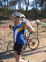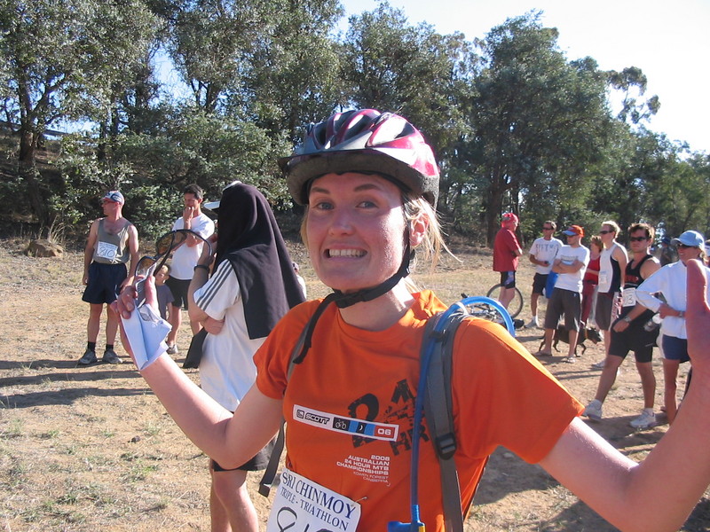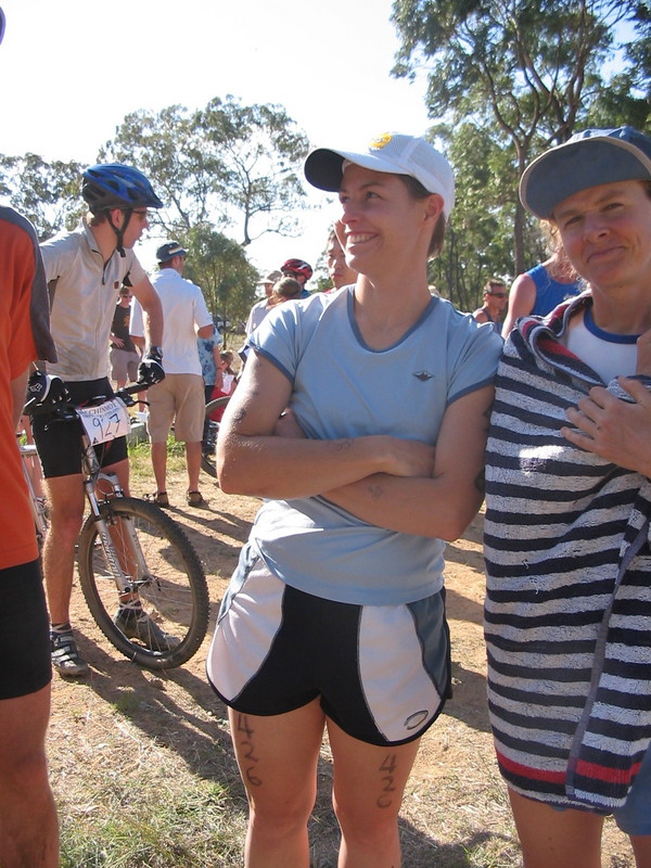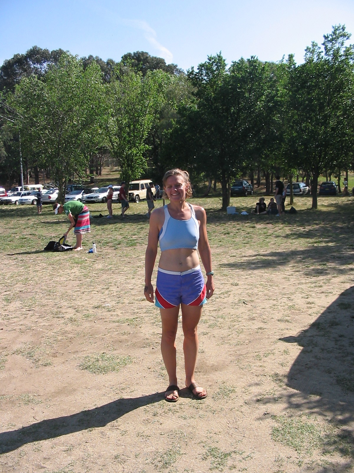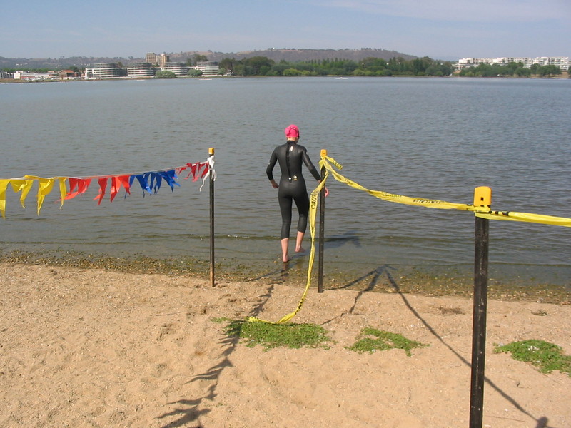 Another Triple Triathlon had rolled around, once more I was blessed to be able to race with Bruce and Shanyn, two incredibly good athletes. After riding around 142KM last year (42 KM extra getting between legs) Shanyn said it was imperative I had support to drive me around this year, I tended to agree as I remember feeling rather bad with cramps last year. I talked my sister Jane into coming down from Sydney for the weekend to support us in the event. As it is my habit to use the same name for the same team, our team name was once more "32 Flavours", this year I had decided to go and acquire the t-shirt from Righteous Babe for each of the team members. The "32 Flavours" t-shirt is available in a powder blue or powder red gym t-shirt, unisex sizing (though the red one is more suggested as a women's shirt). On the front are the words "32 Flavors, And Then Some" on the back is the righteous babe logo. I ordered 3 t-shirts at the beginning of November, one Small, one Medium and one Large. Unfortunately they were out of stock of the medium (for Bruce) and sent the Small and Large, both of which arrived 2 days before the Triple Tri, however the Medium has never arrived. They claim it was sent around November 15th, however it still has not arrived by February 6th 2007. RBR suggest I contact the Australian Customs to see if they know where it is, I am now waiting to see if Customs can shed any light on the missing T-shirt, thus I have no team photo all in the shirts yet. Thus on Saturday afternoon, Jane, Bruce, Shanyn and I met in town at the registration to get our bib numbers and sit down for a coffee so we could have a chance to trash talk all the other teams.... umm I mean discuss race strategy, or something. As is generally the case we are not really there to be serious, mostly to have fun because the triple tri is a really fun day out and about in Canberra. Sure it would be kind of nice to finish our run of 2nd place trophies with a 1st, but hey what does it matter we were more interested in how much we could enjoy all the legs we would embark upon the following day. This year we decided to go for a slight change, as doing all three runs is a huge ask, Shanyn had volunteered to do the final run rather than Bruce. With no current injuries and a fair bit of running training under her belt (diversifying from Swimming is fun anyway) Shanyn was keen to give it a go, especially if it meant the day was less intimidating and more fun for Bruce. Of course a small problem had cropped up, Shanyn competed in a Triathlon the weekend before Triple Tri, doing the run with wet feet and no socks she developed a really nasty blister on the arch of one foot that had since opened up and had her limping around today. However she still bravely wanted to do the run even though it was likely to be a painful exercise on the injured foot. Sunday morning rolled around and Jane and I got ourselves over to the first swim start in time to say hi to Shanyn and a bunch of other people before they got in the water. Jane would be picking Bruce up near his place once I had left for the bike leg and they would both be at the end of the first bike. Once the three person teams had started I rode around to the bike start area and waited. As is generally the case, Shanyn did a blisteringly fast swim and I was on the bike in 4th place, around 30 seconds behind Adrian and a second or two behind Davo. Davo and I worked together a bit as we rode up through Uni of Canberra, we caught up to and passed the rider of another team who had a blisteringly fast swimmer, however we never quite caught Adrian (got within about 10 metres), as we crossed the road from the Uni to Radford heading up to Gossans hill Davo's surges when ever he got out of the saddle had gotten to me and I had to let him go. I had more people start to pass me after I got to the bitumen on the climb to the summit of Black Mountain, Brad passed me there, then Kevin, and Steve passed me on the climb to the shoulder near little black. I had been expecting Steve to catch and pass me, they were likely to beat us this year as they had a dedicated runner on their team instead of doing the event as a mixed pair. I was from this point able to stay fairly close to Kevin for the rest of the bike leg, however Steve was moving much faster than either of us and that was the last I saw of him for this leg. I caught Randall just coming out of Bruce Ridge and he seemed to be comfortable and happily cruising along, then I passed Julie near the end of O'Connor ridge and soon after had a photo of me taken by Dave who was out cheering people on (along with a large crew of spectators that gather at the Dryandra St gate to see us all come through). I got to the end of the leg and Bruce was ready and waiting, I did less than 1h45m so we were on a good schedule so far for the day. Bruce set off for the long run and there is an interesting story to come out of this. Most years we have caught and passed Trevor (solo winner 2006 and 2005, 2nd place solo in 2004) somewhere on the second bike leg or the second run leg. This year Bruce caught and passed him on the first run (they even caught the passing manoeuvre on a camera). According to Bruce as he went past and said Hi, the only thing Trevor said was "Shit I am going slower than last year" or words to that effect. Jane and I arrived at the east basin swim start and found a few other fast teams there, though the lead two teams had already gone through at this point. Cristy got into the water a little before Bruce returned, however Shanyn was likely to get out of the water well in front so I could have the fun of being passed by Steve again. With Shanyn in the water we made our way over to Acton Ferry terminal and found Bruce's family had turned up to see the action there. By the time we got to the Ferry terminal Adrian's team and Davo's team had already transitioned, we got to see a few other teams go through, such as Kevin's team before Shanyn ar